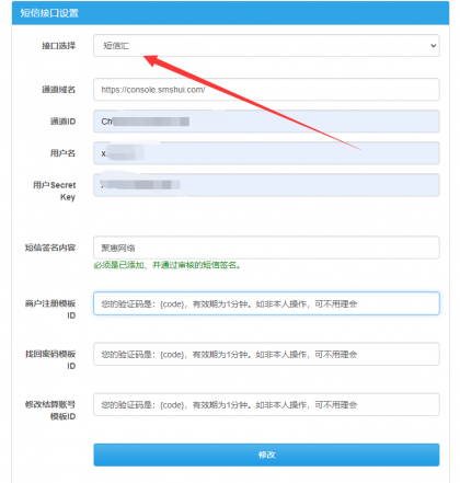 将文件上传并覆盖到根目录(切记不要忘记备份),在后台系统设置->邮箱与短信菜单处选择短信接口为短信汇,并填写对应信息保存即可